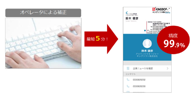 名刺を読み込んだ瞬間にオペレータ補正の依頼が掛かりますので、最短5分後で補正が完了します。